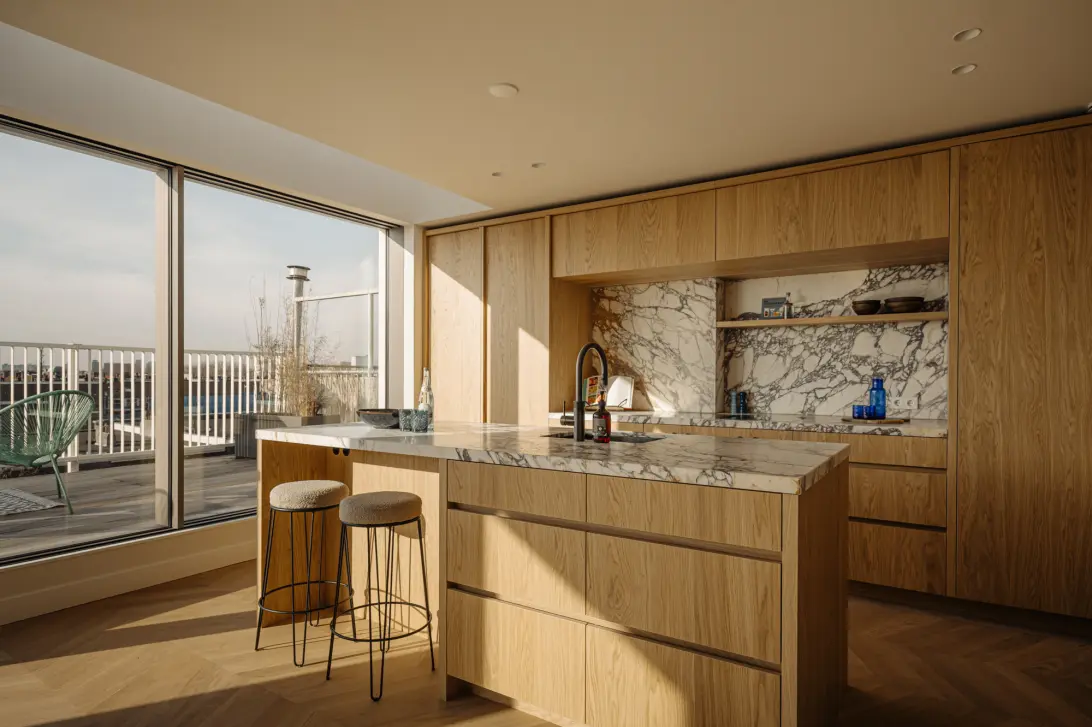 Een heerlijk en licht appartement met een geoptimaliseerde indeling, verdeeld over circa 142 m², met vrij uitzicht aan zowel de voor- als achterzijde. De woning is luxe afgewerkt met verfijnde materiaal- en kleurkeuzes en biedt het comfort van turn-key wonen op een rustige en aantrekkelijke locatie. Uniek is dat de lift rechtstreeks uitkomt in de hal van de woning, die is voorzien van maatwerk kastruimte. Het woongedeelte strekt zich uit over de royale breedte van circa 13 meter. De indrukwekkende, op maat gemaakte glazen pui van vloer tot plafond zorgt voor uitzonderlijk veel licht en laat binnen en buiten naadloos in elkaar overgaan. De lichtstraat over de volledige breedte versterkt dit ruimtelijke gevoel en zorgt voor een bijzondere sfeer. Aangrenzend aan de living ligt een heerlijk terras van circa 39 m², gelegen op het westen, waar je kunt genieten van de middag- en avondzon. De luxe open keuken is uitgevoerd met een prachtig eikenhouten eiland met bar en is voorzien van hoogwaardige inbouwapparatuur, waaronder een Quooker, koelkast met vriesladen, twee Gaggenau ovens, een inductiekookplaat met geïntegreerde afzuiging en een Miele?vaatwasser. Via de architectonische trap in de living bereik je het tweede dakterras van circa 45 m². Het appartement beschikt over drie slaapkamers en twee moderne badkamers. De hoofdslaapkamer heeft ingebouwde kasten en een ensuite badkamer met ligbad, wastafelmeubel en inloopdouche. De tweede slaapkamer beschikt eveneens over een eigen badkamer met wastafelmeubel en inloopdouche. De derde kamer is ideaal als werk- of studeerkamer.