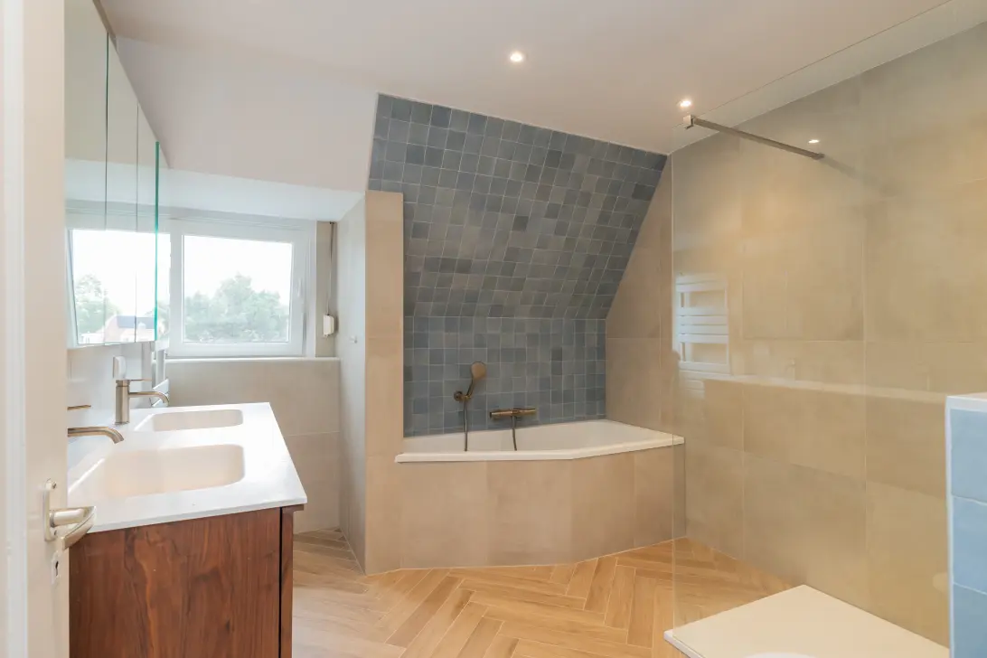 Ook de 2e etage beschikt over een ruime overloop met een vaste kast met c.v opstelling en was/droger aansluiting. Aan de voorzijde zijn 2 slaapkamers en aan de achterzijde is de 3e slaapkamer met balkon en de moderne badkamer (2022) met groot wastafelmeubel, ligbad, inloopdouche en 2e toilet.