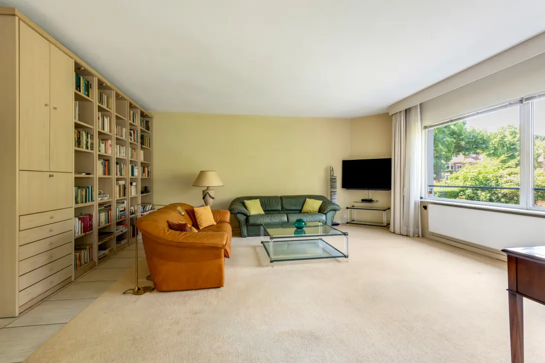 Spacious hall with videophone system and built-in wardrobe space, hanging toilet and washbasin. Access to the living room from the spacious hall. The living room is built in a Z-shape and therefore offers plenty of space for a dining area and several sitting areas. Through the many windows in the living room you can enjoy the view on the greenery around the apartment that the communal garden is rich in. From the living room access to the covered terrace located on the southwest.