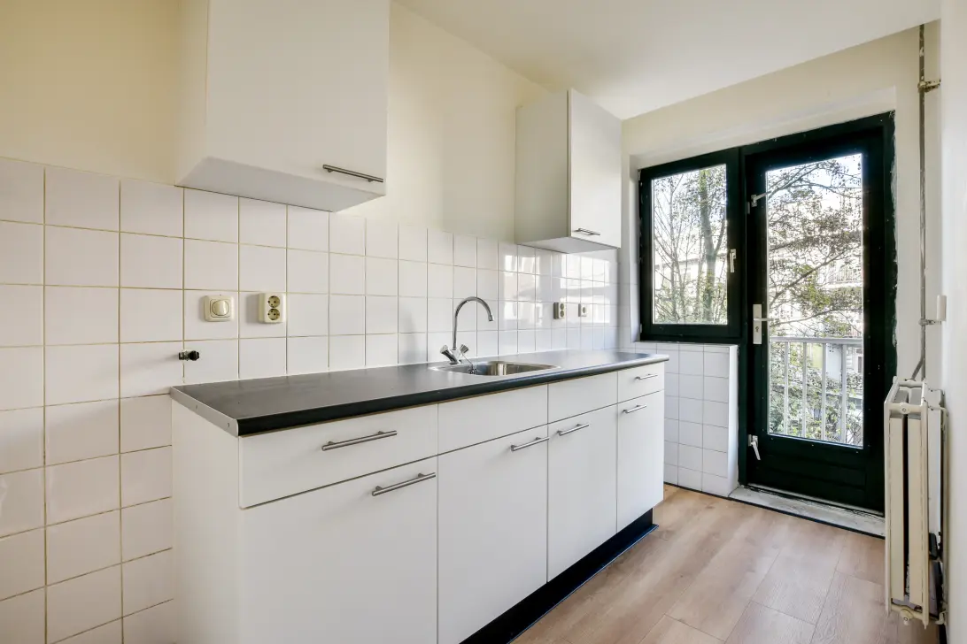 De slaapkamer en keuken bevinden zich aan de achterzijde van de woning. Beide ruimtes bieden direct toegang tot het balkon.
