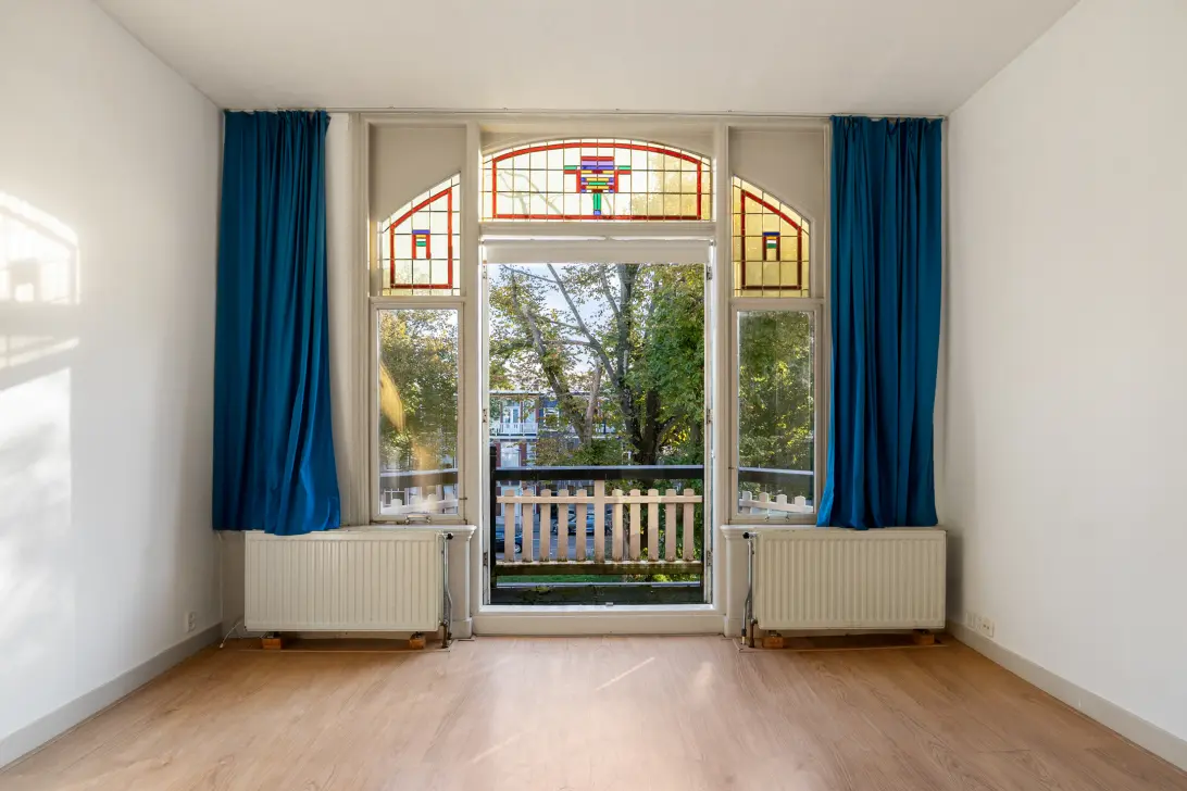 De glas-in-loodramen springen hier meteen in het oog. Aan de voorzijde ligt een royale kamer met laminaatvloer, ingebouwde kast en openslaande deuren naar een balkontje op het oosten. Ook het tweede voorkamertje heeft glas-in-looddetails en een parketvloer.
