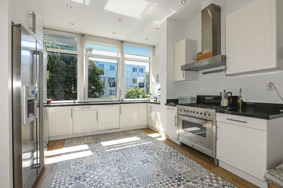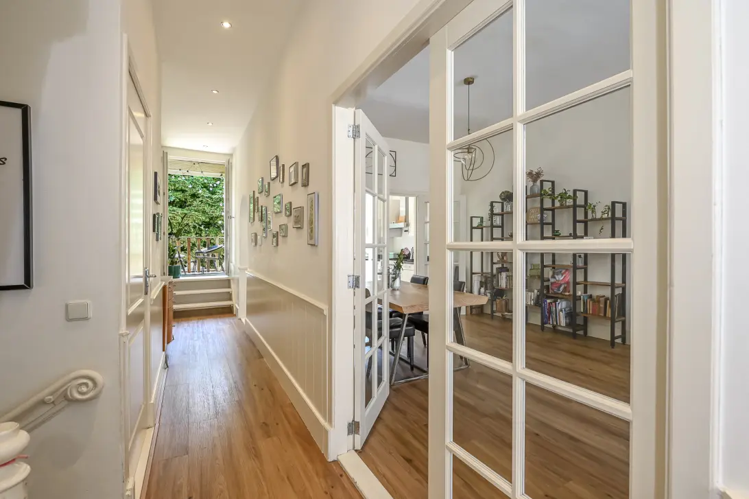 Lichte gang met fraaie deuren met glas-in-lood, hoge plafonds (3,10 m) en een ruime living met ruime open keuken. De woonkamer en keuken lopen vloeiend in elkaar over, met samen een lengte van ruim 12 meter. De moderne keuken is uitgerust met een 6-pits Boretti gasfornuis met brede oven, nieuwe inbouwvaatwasser en dubbeldeurs Amerikaanse koelkast met ijsmachine. De brede raampartij biedt uitzicht op de groene bomen achter de woning. Via openslaande patiodeuren bereik je het zonnige terras (14,5 m²) met loggia, waar je tot ‘s avonds laat van de zon geniet. Deze verdieping biedt verder een stijlvol toilet en een zijkamer, bijvoorbeeld te gebruiken als garderobe.