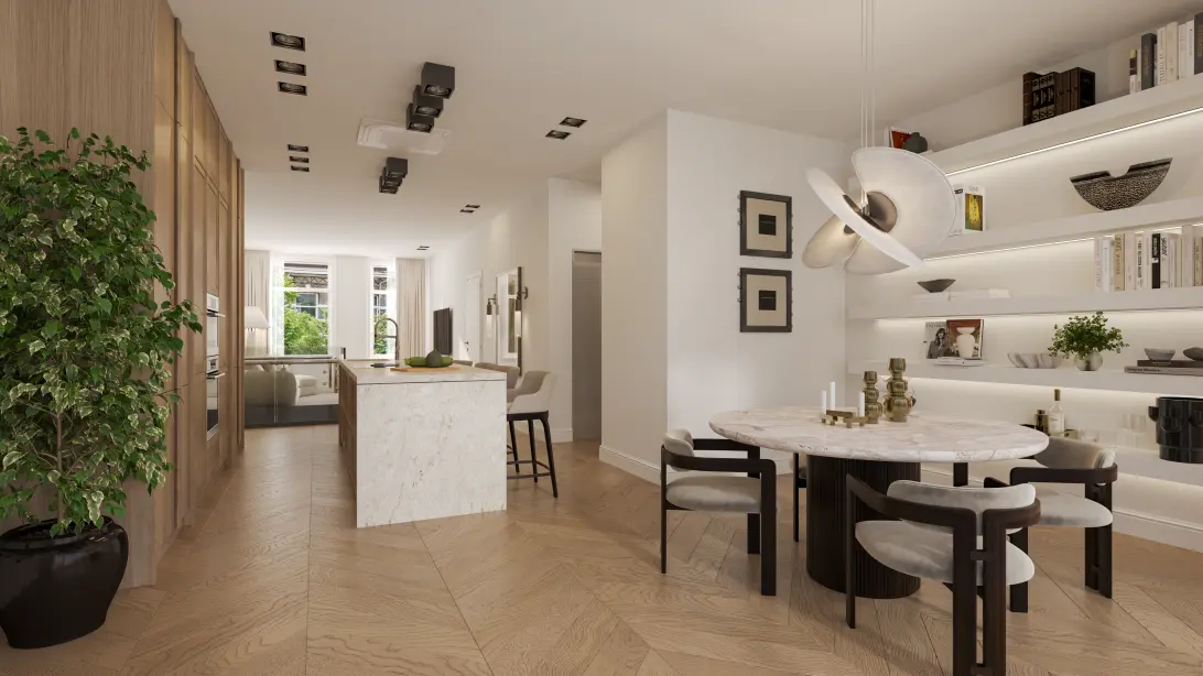 Located in one of the most beautiful and beloved streets of Amsterdam Oud-Zuid, almost directly next to Cornelis Schuytstraat, is this exceptional ground floor apartment of approx. 220 m2 GFA – 194 m2 GO (NEN 2580), renovated with “Swiss precision.” The apartment is part of a high-quality renovated building with a renewed foundation, a modern, wheelchair-accessible 5-person elevator, and lovely outdoor spaces. Here, the charm of the 1903 construction year and the comfort of today come together perfectly.