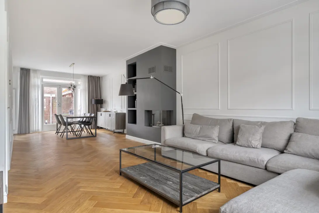 The charming entrance is accessed via the front garden. From the entrance hall, which includes the utility cupboard with the fuse box, the route leads to the central hallway, where a separate toilet and a practical storage closet for the staircase are located. This stair closet provides access to the spacious living room, which is finished with a beautiful herringbone floor and features an atmospheric gas fireplace. French doors seamlessly connect the living room to the garden. The modern, semi-open kitchen is equipped with various built-in appliances and offers plenty of storage in cabinets and drawers. The sheltered garden features a practical storage shed and a back entrance, and thanks to its western exposure, it enjoys abundant afternoon and evening sun. Via the back entrance you can also reach the spacious storage.