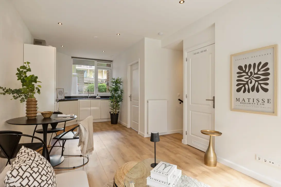 Via de eigen entree betreed je de woning. De hal biedt toegang tot een separaat toilet en leidt naar de lichte woonkamer met open keuken. Dankzij de grote raampartijen valt er veel natuurlijk licht binnen, wat zorgt voor een aangename en open sfeer. De keuken is praktisch ingedeeld en voorzien van diverse inbouwapparatuur alsmede voldoende opbergruimte.