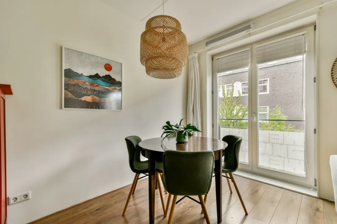 De woonkamer is licht en rustig dankzij de grote raampartijen richting het autovrije hofje. Je kijkt groen weg, zonder verkeer dat langs je gevel trekt. Het voelt ruim en kalm, precies wat je wilt na een dag in de stad.