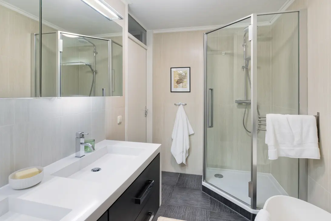On the lower sleeping floor, you will find three spacious bedrooms, two of which have access to the sunny Loggia (south) with wide accordion folding doors that can be opened across the entire width, allowing you to enjoy the sun. Adjacent to this is the spacious, luxurious bathroom with a double sink, a designer bathtub and a shower cubicle with thermostatic tap and hand and rain shower.
