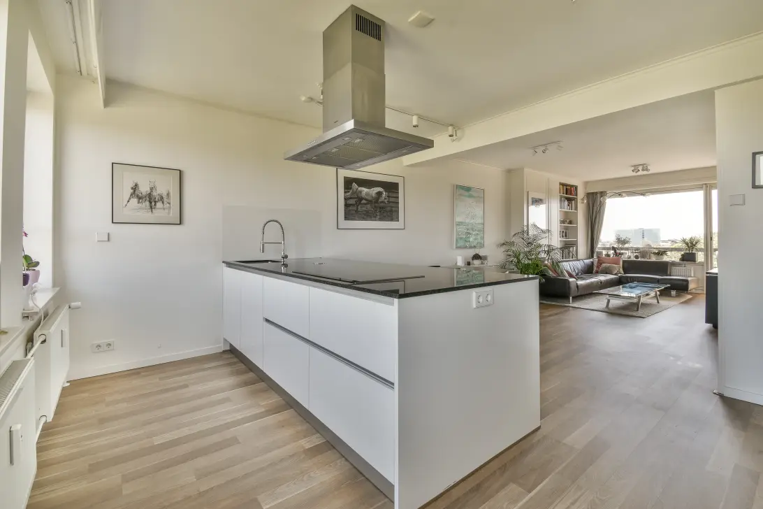 De lichte woonkamer is voorzien van royale raampartijen en geeft toegang tot een van de drie balkons. Aansluitend vindt u de moderne open keuken met kookeiland, die is uitgerust met diverse hoogwaardige inbouwapparatuur: een 5-pits inductiekookplaat, koel-/vriescombinatie, stoomoven, combimagnetron, oven en een spoelbak.