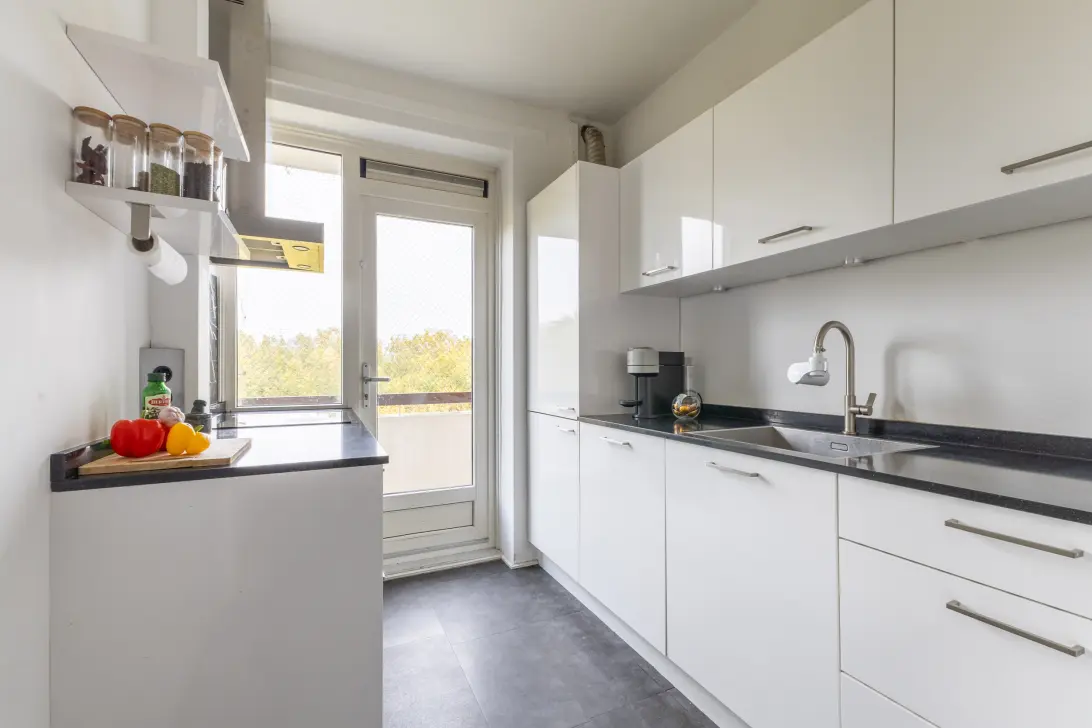 De keuken is in 2022 vernieuwd en voorzien van een composiet werkblad, inductiekookplaat, vaatwasser, combi manetron oven en afzuigkap. De koelkast is ouder, maar functioneert prima. De keuken ligt aangenaam licht en biedt direct toegang tot het balkon