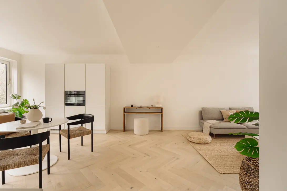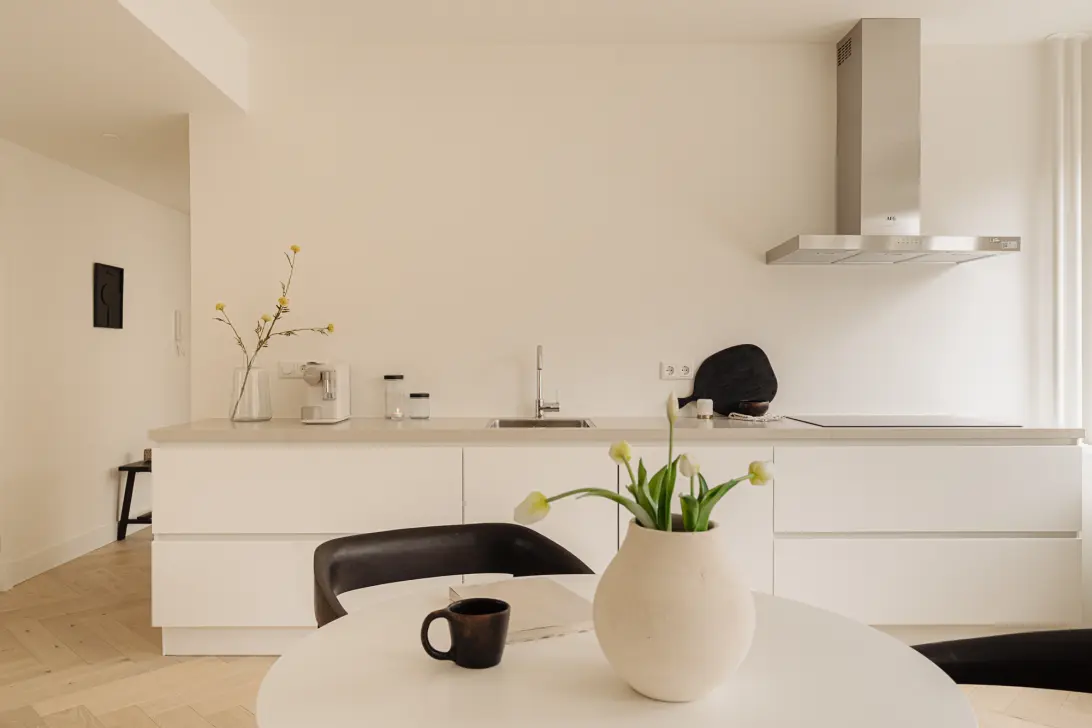 The generous, bright living room benefits from large windows. From here, you have access to the south-facing balcony, where you can enjoy the sun all day long. The modern open kitchen is finished in a sand-white tone, equipped with a stylish stone countertop and various built-in appliances. From the kitchen, you have a view towards the Zuidas.