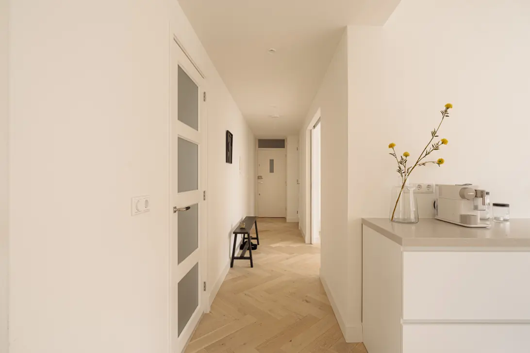 Via de gemeenschappelijke afgesloten entree met lift of trappenhuis bereik je het appartement op de tweede verdieping. Bij binnenkomst tref je een ruime hal met toegang tot alle vertrekken.