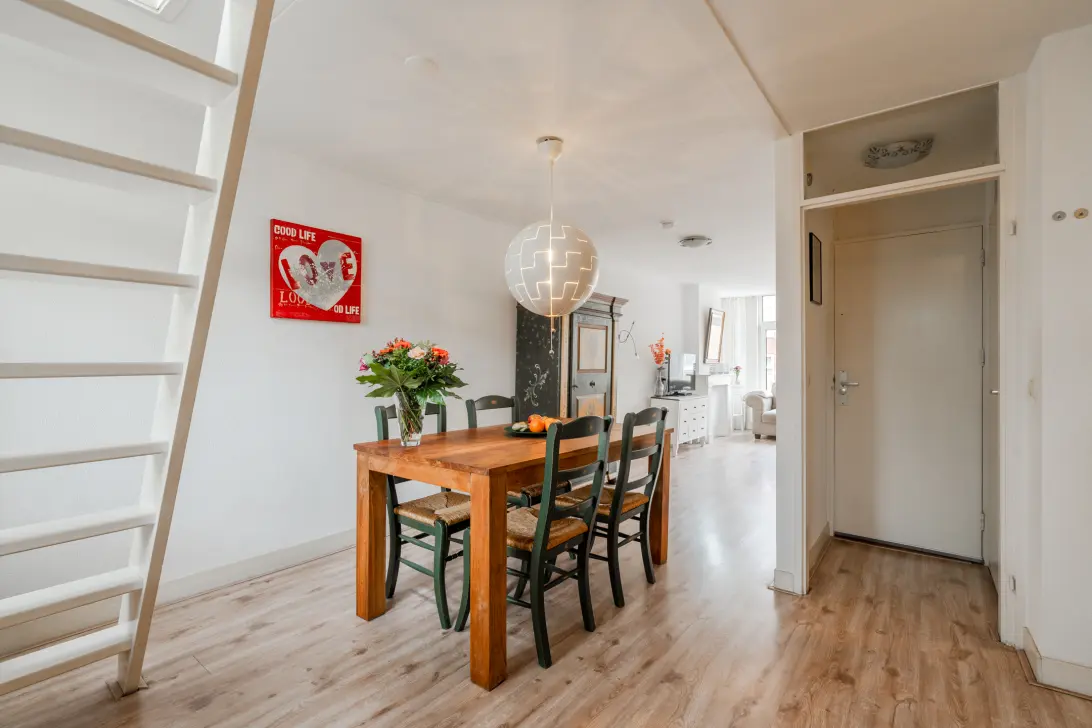 De entree van het karakteristieke pand bevindt zich op de begane grond. Via het gemeenschappelijke trappenhuis komt u op de derde etage bij de eigen voordeur van dit fijne appartement. Hier treft u ook de meterkast. U komt binnen in een halletje, waar zicht ook de toiletruimte bevindt met een (vrijhangende) toilet en betreedt u de woning in de eetkamergedeelte met open keuken. Het valt direct op hoe heerlijk licht dit appartement is. De keuken is voorzien van diverse inbouwapparatuur, zoals koel-/vriescombinatie, combimagnetron/oven, 4-pits gasstel, RVS afzuigschouw en een terrazzolook werkblad. De eetkamer is ruim en heeft plaats voor een grote eettafel. In het eetkamer gedeelte is de interne trap naar de zolderkamer.