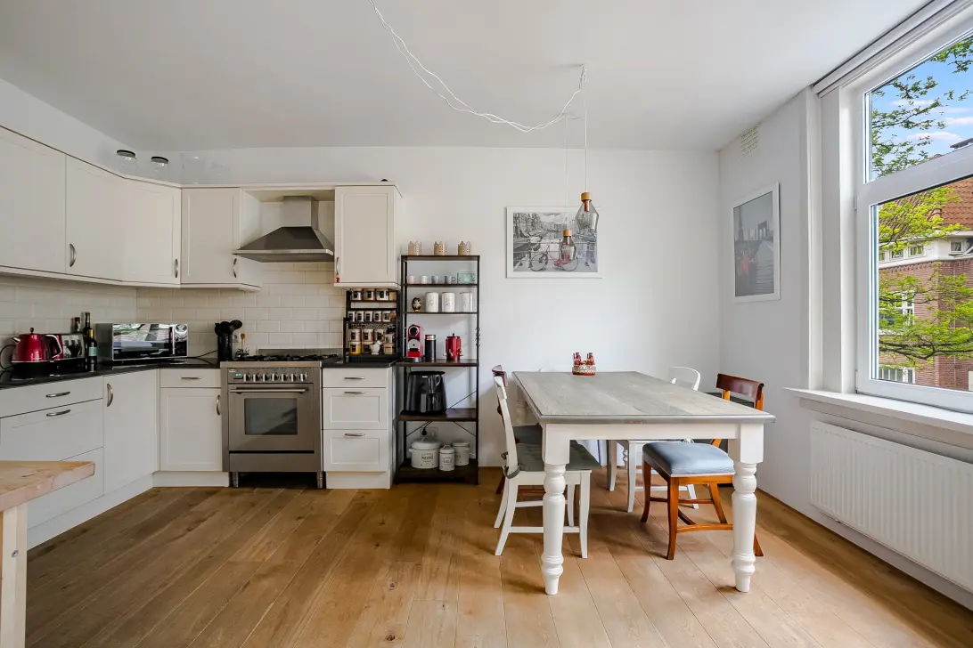 Located on Van Rensselaerstraat at the corner of Bonairstraat, this well-maintained three-room apartment offers a spacious living room with a bay window, a kitchen-diner, two well-sized bedrooms, a bathroom, and a separate closet for the washing machine.