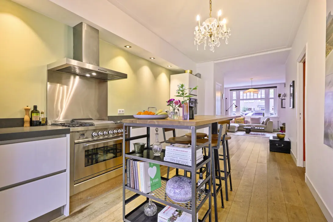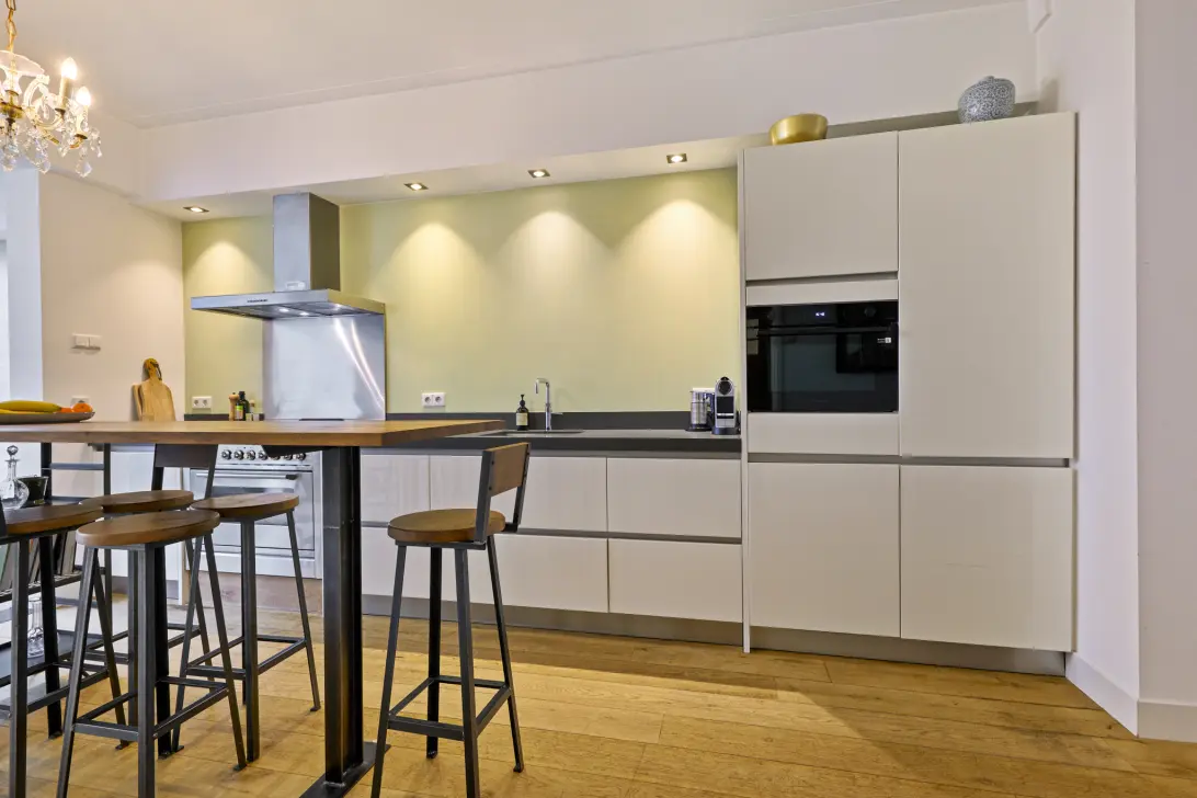 Aan de voorzijde ligt de charmante woonkamer, voorzien van een grote raampartij, die uitkijkt op het groen, en een authentieke schouw. De woonkamer loopt vloeiend over in de centraal gelegen keuken, die aansluit op de achtergelegen eetkamer. De keuken is uitgevoerd met witte kasten en lades, gecombineerd met een massief, donker gemêleerd werkblad. Daarnaast is de keuken uitgerust met diverse inbouwapparatuur, waaronder een Boretti 5-pits gasfornuis en een Quooker.