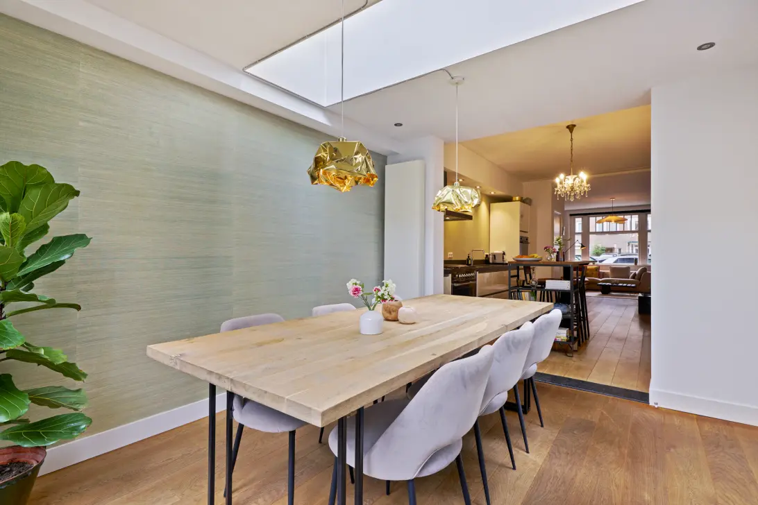De eetkamer bevindt zich in de uitbouw aan de achterzijde en is voorzien van een brede lichtstraat en plafondhoge openslaande deuren naar de tuin. Deze zonnige tuin van ruim 45m², gelegen op het zuiden, is aangelegd met houten terrasdelen, klinkers en groene borders. Achterin de tuin staat een geïsoleerd tuinhuis met vloerverwarming en inbouwkasten, dat zich uitstekend leent als werkruimte, hobbyruimte of logeerplek.