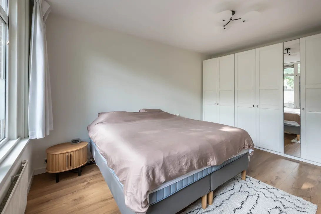 De hoofdslaapkamer ligt aan de achterzijde, direct naast de badkamer, en biedt veel ruimte (ca. 16m²). De tweede slaapkamer is geschikt als volwaardige slaapkamer, werkruimte of kinderkamer en beschikt over vaste kastruimte (ca 8m²). Vanuit deze kamer is er toegang tot het balkon. gelegen op het Westen!