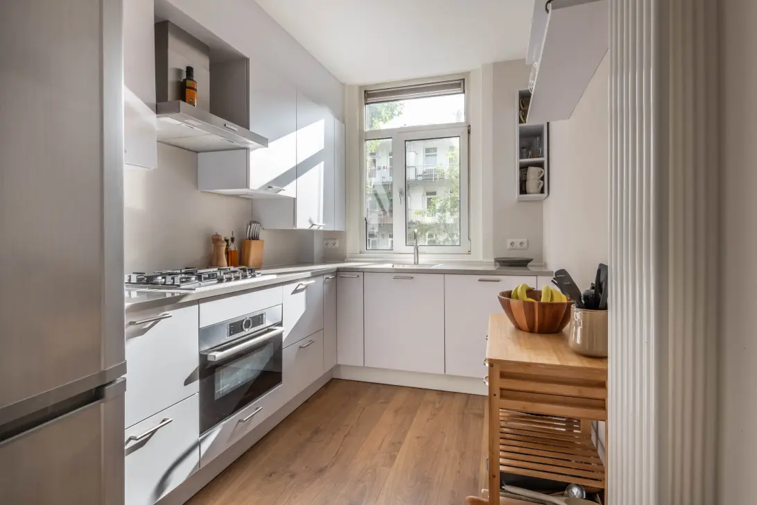 De keuken bevindt zich aan de achterzijde van de woning en is uitgerust met een 4-pits gasfornuis, combi-oven, spoelbak en voldoende kast en werkruimte. Het raam boven het aanrecht zorgt voor een prettige inval van natuurlijk licht.
