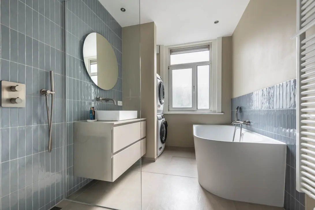 Tevens is de aansluiting voor de wasmachine en de droger in de badkamer gevestigd, deze is netjes weggewerkt in het ontwerp van de badkamer. De badkamer is geheel gerenoveerd in 2021. Het separate toilet bevindt zich in de gang en is betegeld in hetzelfde stijlvolle tegelwerk als de badkamer.