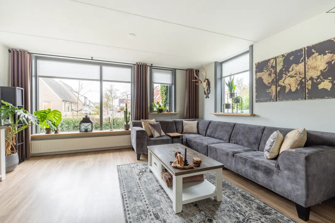 De woonkamer ligt aan de voorzijde en voelt direct ruim en licht aan. Alle wanden zijn strak gestuukt en dankzij de ramen aan de voorkant geniet je hier van een prettige lichtinval.