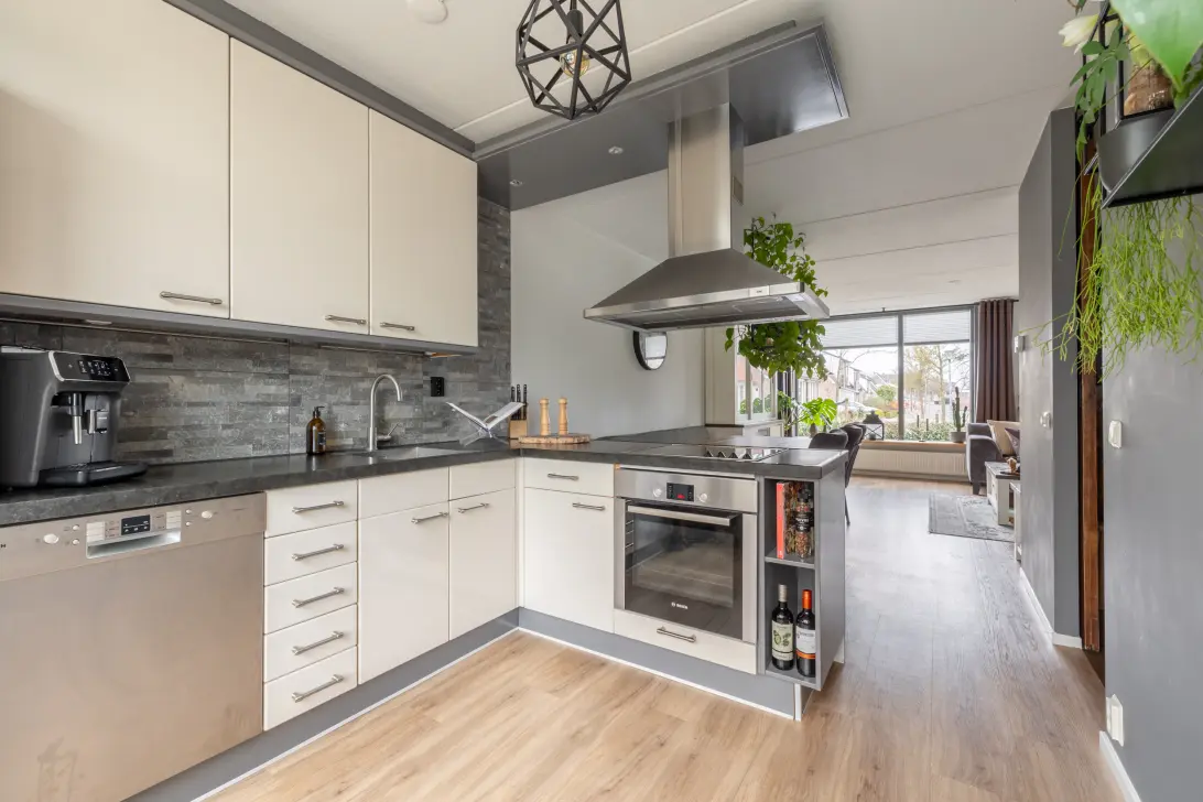 Aan de achterzijde ligt de keuken. Een fijne plek met zicht op de tuin en tijdens het koken sta je in contact met je familie die al aan tafel zit te borrelen.