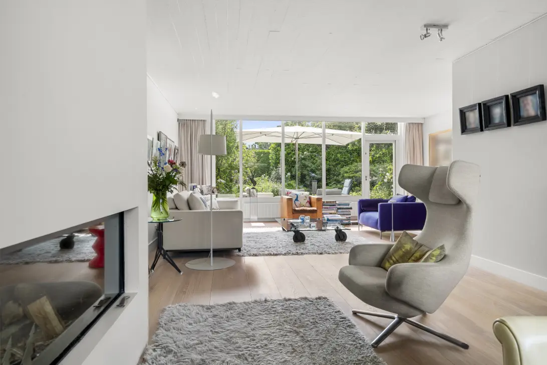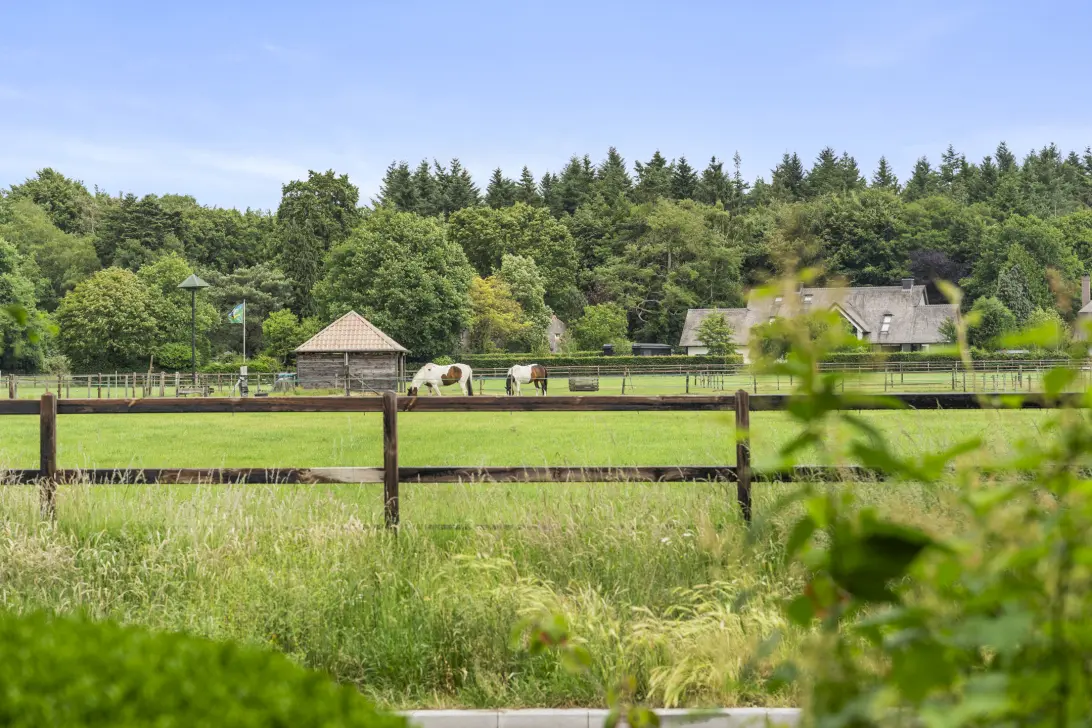 De woonkamer is opvallend royaal van opzet en kent een speelse indeling met meerdere sfeervolle hoeken, waardoor elke plek zijn eigen karakter en functie krijgt. Deze indeling maakt de ruimte niet alleen praktisch, maar ook warm en uitnodigend. Aan de voorzijde van de woning is de eethoek gesitueerd, een fijne plek om samen te komen met uitzicht over de uitgestrekte weilanden en de bossen daarachter. Daarnaast vindt u een gezellig zitje rondom de open haard. Hier komt u samen voor een ontspannen avond of geniet u in alle rust van een goed boek. De combinatie van licht, ruimte en sfeer maakt dit tot een leefruimte waar u zich direct thuis voelt. Aan de achterzijde van de woning bevindt zich een royale zithoek, waar comfort en rust samenkomen. Dankzij de grote ramen geniet u hier van een prachtig uitzicht op de groene, besloten tuin. Het vele daglicht en de verbinding met buiten maken dit een heerlijke plek waar binnen en buiten moeiteloos in elkaar overlopen.
