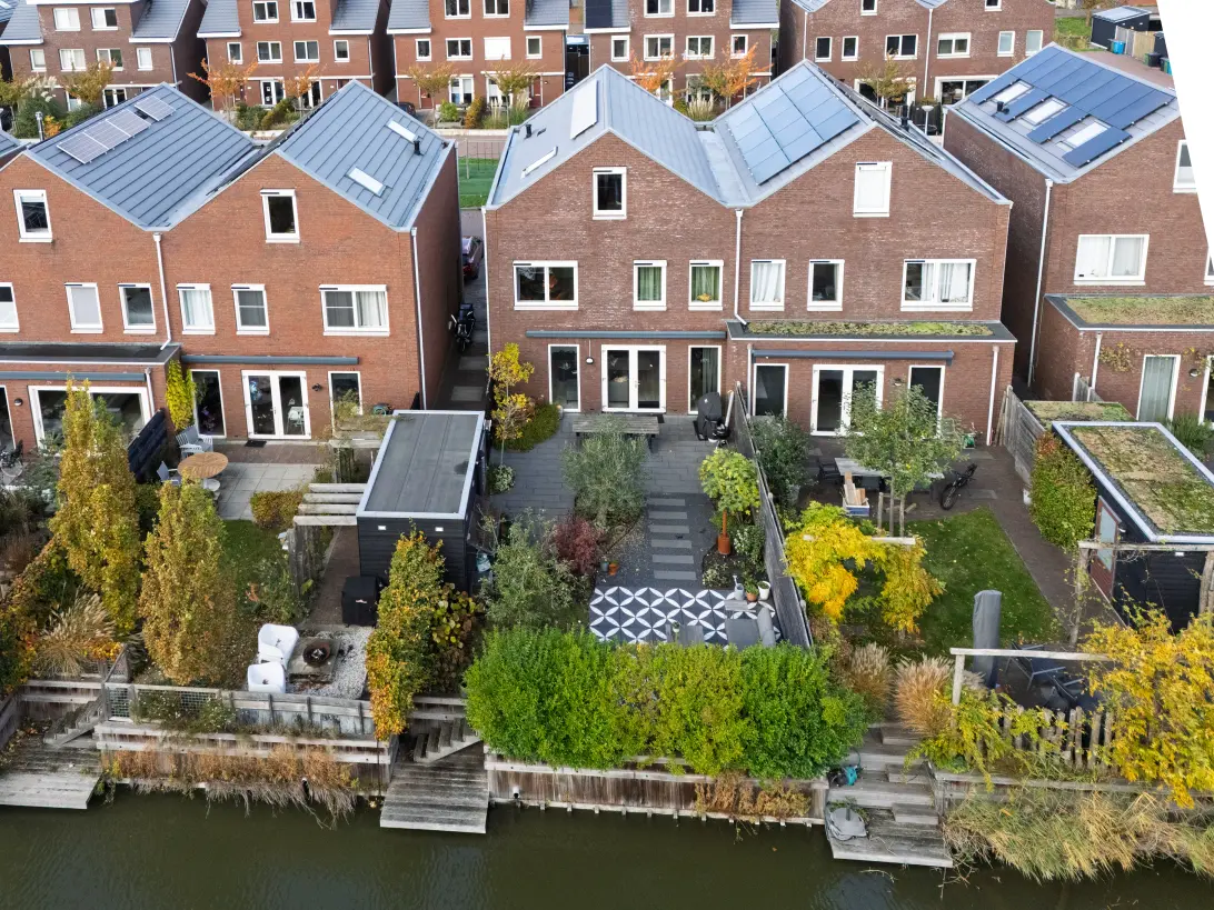 Aan de achterzijde ligt het woongedeelte met zicht op de fraai aangelegde tuin. De woonkamer is breed en biedt voldoende ruimte voor een royale zithoek. De zonnige achtertuin op het zuiden beschikt over een groot terras, een broeikasje, een houten berging en een steiger aan het water. In de zomer stap je hier zó vanaf je eigen tuin op je supboard! De tuin is ook bereikbaar via een achterom langs het huis.