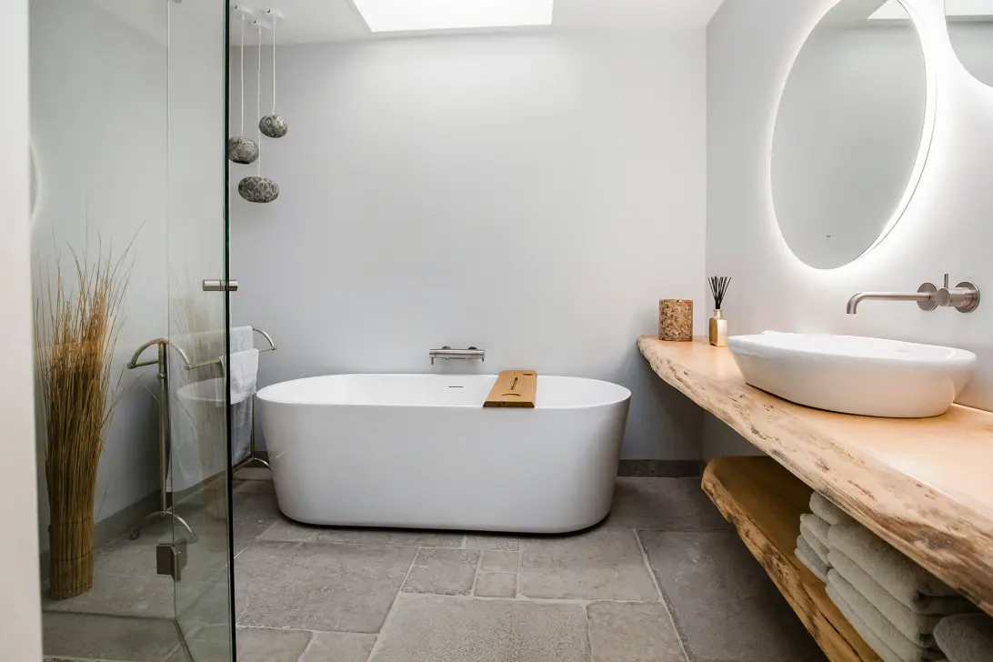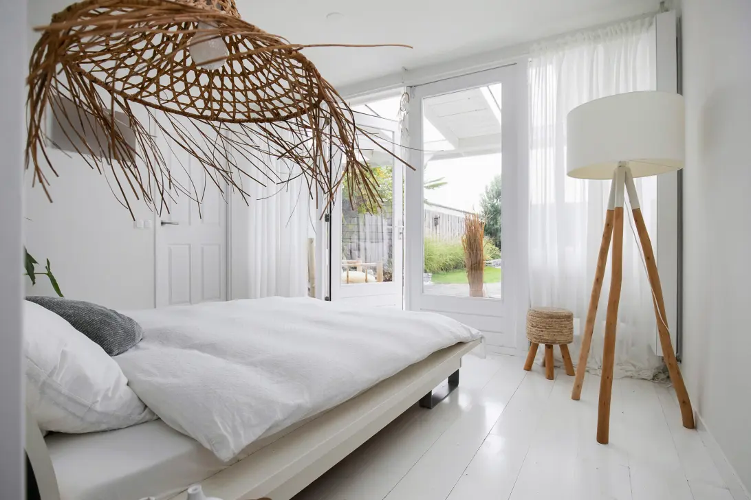 In de uitbouw vindt u de lichte slaapkamer met inloopkast, badkamer en-suite en openslaande deuren naar de overkapping. De moderne badkamer heeft een ligbad, wastafel, inloopdouche en vloerverwarming.