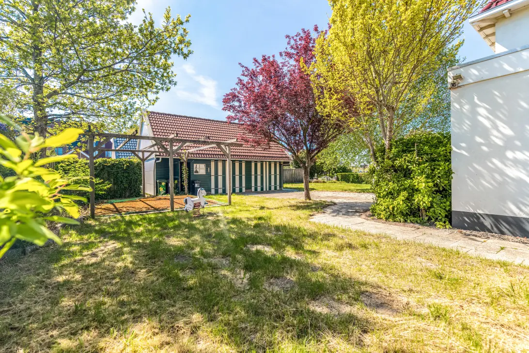 De oprit biedt ruimte voor meerdere auto's. De tuin is ruim opgezet en voorzien van veel groen. Aan de rechterkant bevindt zich een grote garage. Hoewel deze wat aandacht nodig heeft, biedt deze bijvoorbeeld de mogelijkheid om als hobbyruimte te worden gebruikt. De schuur is opgedeeld in twee ruimtes en beschikt over twee openslaande deuren. Daarnaast is er een aparte berging aan de achterzijde van het perceel, die eveneens in twee delen is gesplitst. De tuin loopt rondom de woning en beschikt over meerdere terrassen. Deze tuin met potentie kan worden omgetoverd tot uw droomtuin.