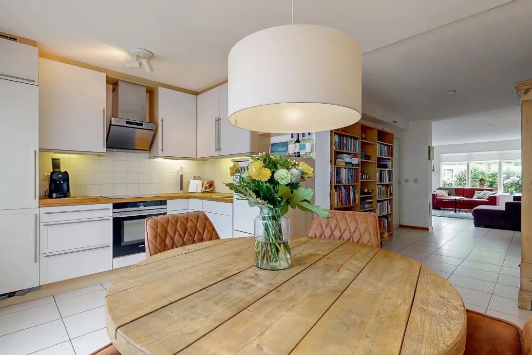 Indeling: zijentree, ruime hal met toilet en trapopgang, straatgerichte woonkamer met prettig lichtinval, half open keuken met L-vormige unit voorzien van inbouwapparatuur en dubbele openslaande deuren naar de tuin. De begane grond is voorzien van een lichte plavuizen vloer en spack wanden.
