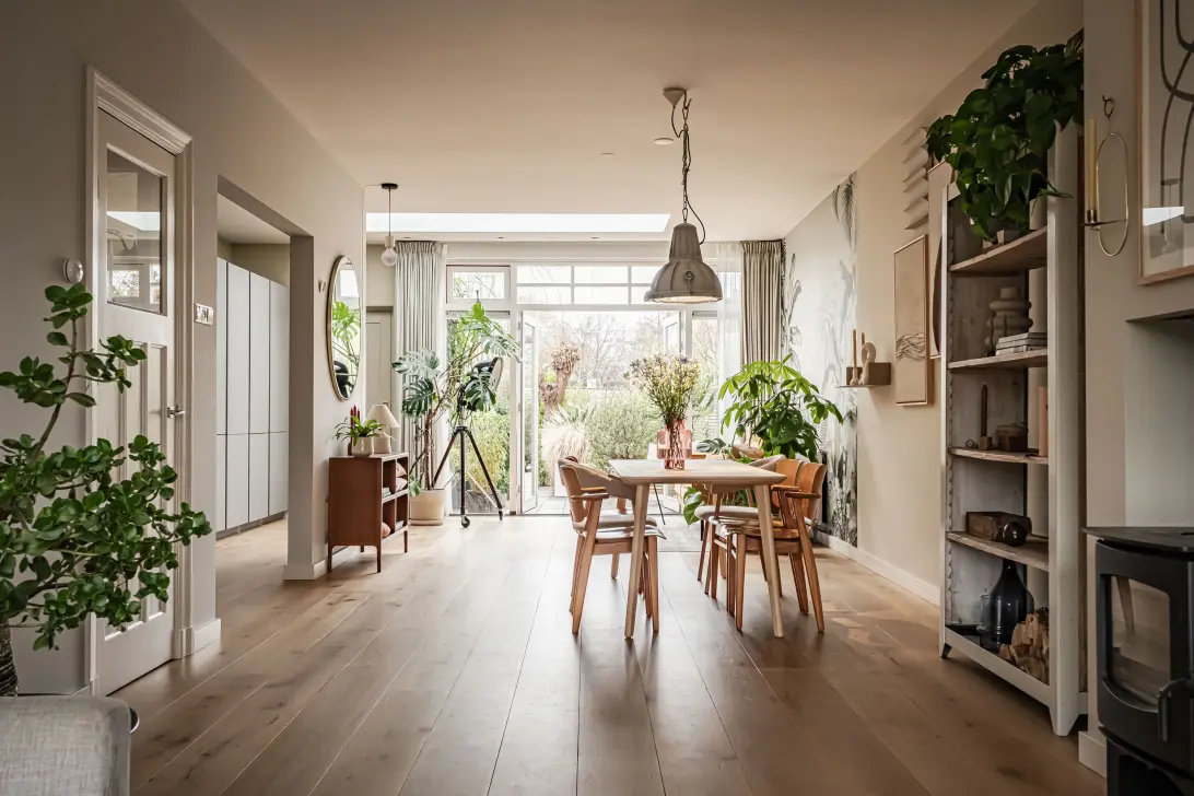 Entree, vestibule met granito vloer en originele wandtegels, gang met trapkast en moderne toilet met fonteintje, de meer dan royaal bemeten woonkamer is in 2016 uitgebouwd aan de achterzijde, hierbij is gebruik gemaakt van een grote pui met veel glas en tevens een lichtstraat (incl. zonwering) waardoor er, tezamen met de erker aan de voorzijde, veel daglicht naar binnen valt. De woonkamer beschikt nu over 2 ruime zithoeken en een fraaie opstelling voor de eettafel. De massieve eikenhouten vloer en de houtkachel maken de sfeer compleet. De moderne open keuken is voorzien van een Quooker, een 6-pits gasfornuis met oven en afzuigkap, vaatwasser, koelkast en vriezer. Er is veel praktische kastruimte aanwezig. Via de keuken bereik je de aangebouwde schuur die voorzien is van elektra.