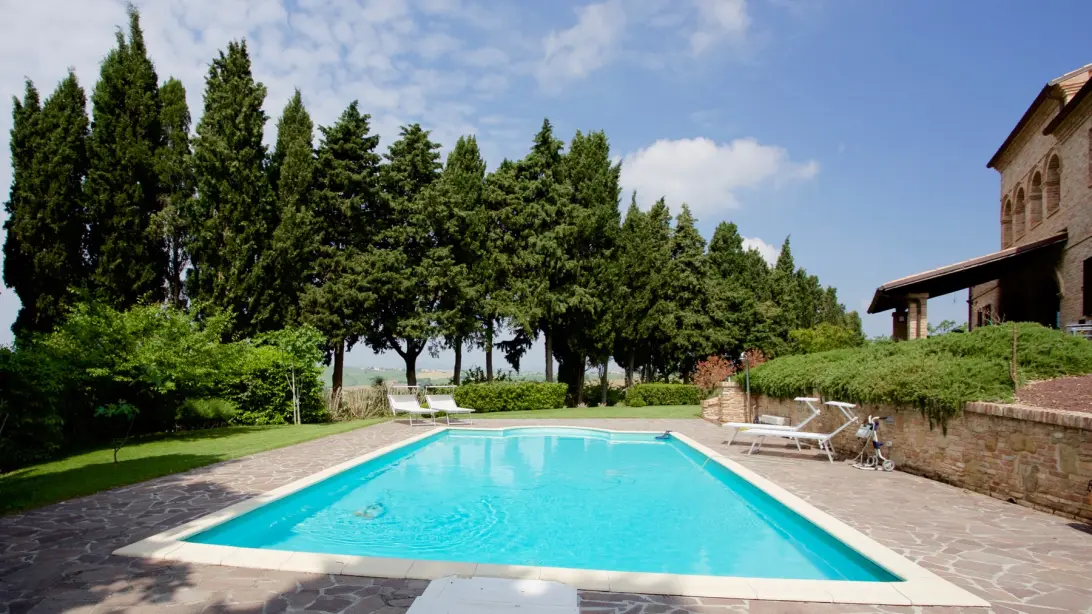 In een unieke en panoramische ligging op het platteland van Marche staat deze gerenoveerde luxe villa met zwembad te koop. Het pand combineert authentieke charme met moderne voorzieningen: de buitenzijde heeft zijn rustieke uitstraling behouden, terwijl het interieur eigentijds en stijlvol is ingericht.