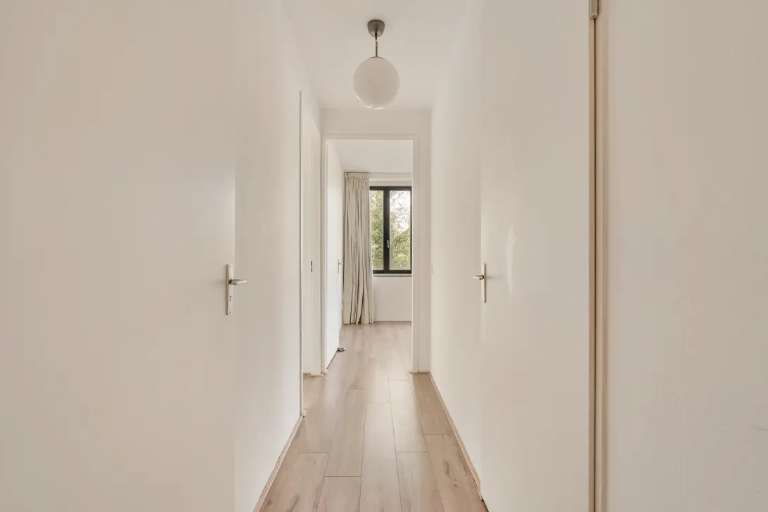 Via het goed onderhouden gemeenschappelijke trappenhuis met lift bereikt u de entree van het appartement. De ruime hal biedt toegang tot alle vertrekken en beschikt over een berging met wasmachine- en drogeraansluiting, evenals een separaat toilet met fontein.