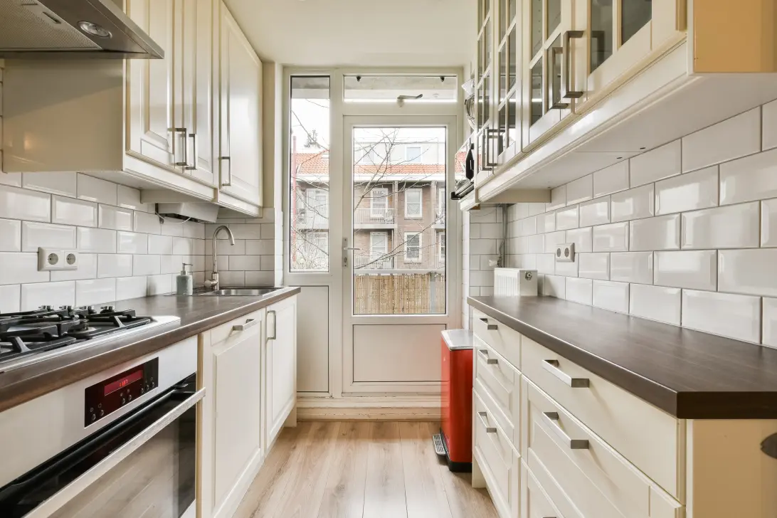 De keuken ligt aan de achterzijde en is voorzien van een 4-pits gaskookplaat, oven, ijskast, vriezer en afwasmachine. Ingebouwd in een van de keukenkastjes zit de recent (2025) vernieuwde cv-ketel. Vanuit hier heb je toegang naar het fijne balkon.