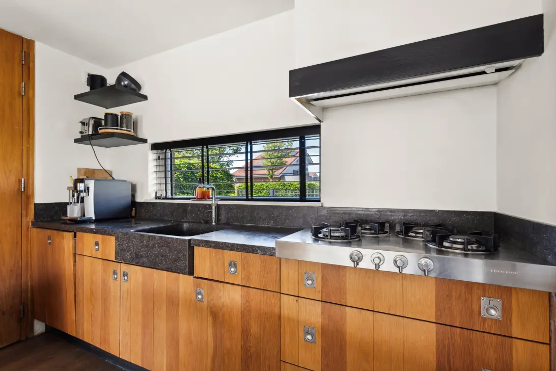 Via het op afstand bedienbare en gefundeerde hek met looppoortje kom je bij de voortuin met ruime parkeergelegenheid. Onder de overkapping door bereik je de interne berging en de voordeur. In de hal vind je de moderne meterkast en een toilet met extra raampje. Via de stijlvolle stalen deur met glas loop je de woonkamer. Aan de voorzijde bevindt zich de prachtige eikenhouten ‘Piet Boon’-keuken met een Belgisch hardstenen blad – een tijdloze uitstraling! Er is een extra deur naar de berging met de CV en aansluiting voor wasmachine en droger.