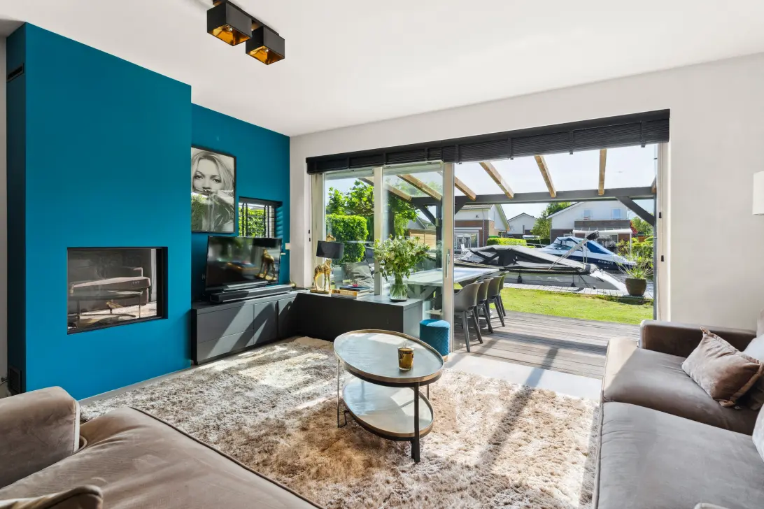 De woonkamer grenst direct aan de tuin en het water. Dankzij de veranda (op palen) kun je hier heerlijk lang buiten zitten.