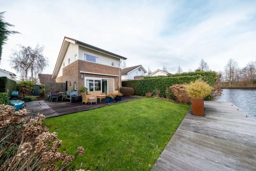 De tuin is fraai gesitueerd aan open vaarwater met vrij uitzicht. Een groot terras direct aan de woning, een verzorgd gazon en een eigen aanlegsteiger maken dit een droomplek voor watersportliefhebbers.