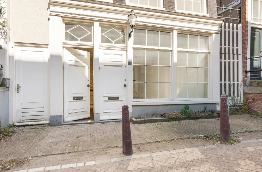 Dubbele entree, hal (verbonden met tussendeur). Entree benedenwoning: hal, woonkamer met ruime bergkast en marmeren vloer met vloerverwarming. Onder deze vloer ligt een betonnen vloer van circa 50 cm dik welke steunt op gepulste, stalen funderingspalen van circa 18 meter lengte. Samen maken deze de fundering welke rond 1978 opnieuw is aangebracht. Ook de trap en het trappenhuis zijn in die tijd geheel vernieuwd.