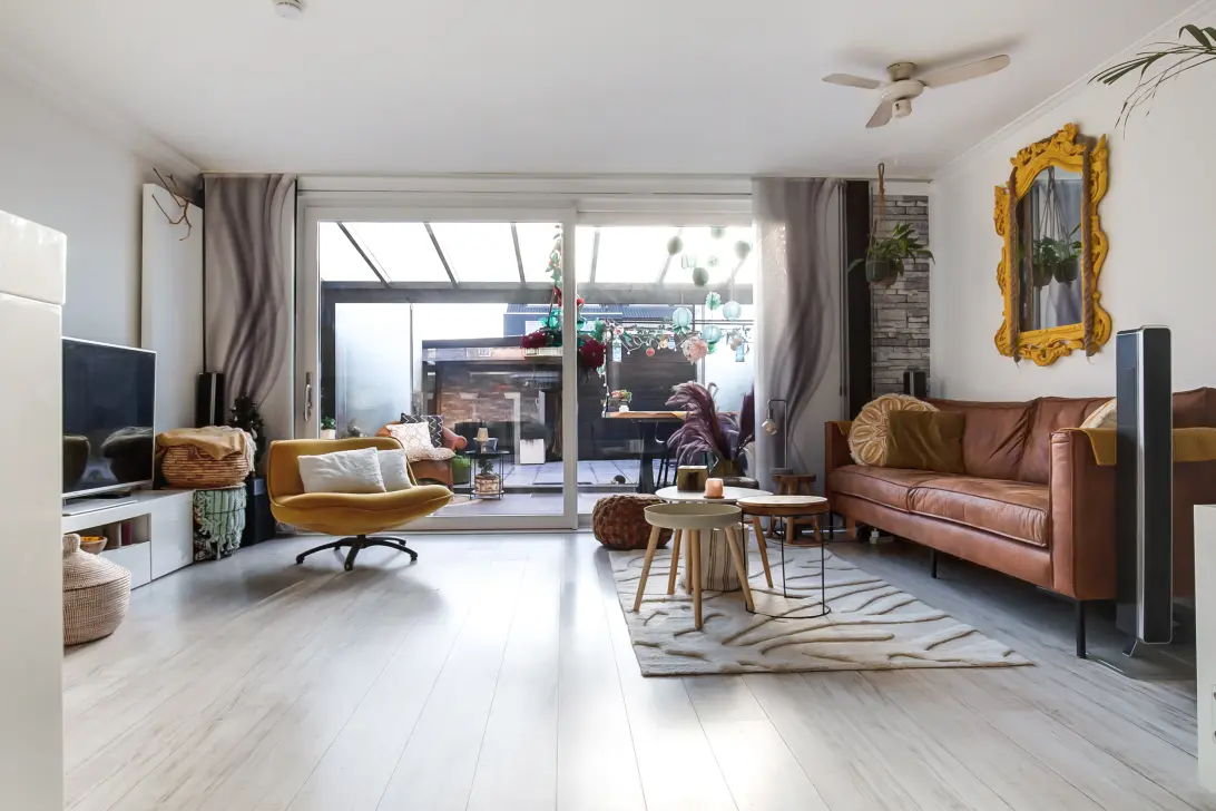 - Zonnige achtertuin op het zuidoosten met glazen overkapping, berging en achterom