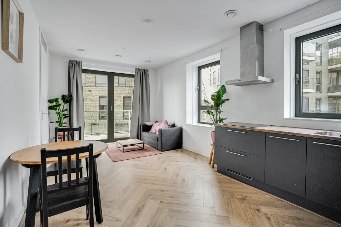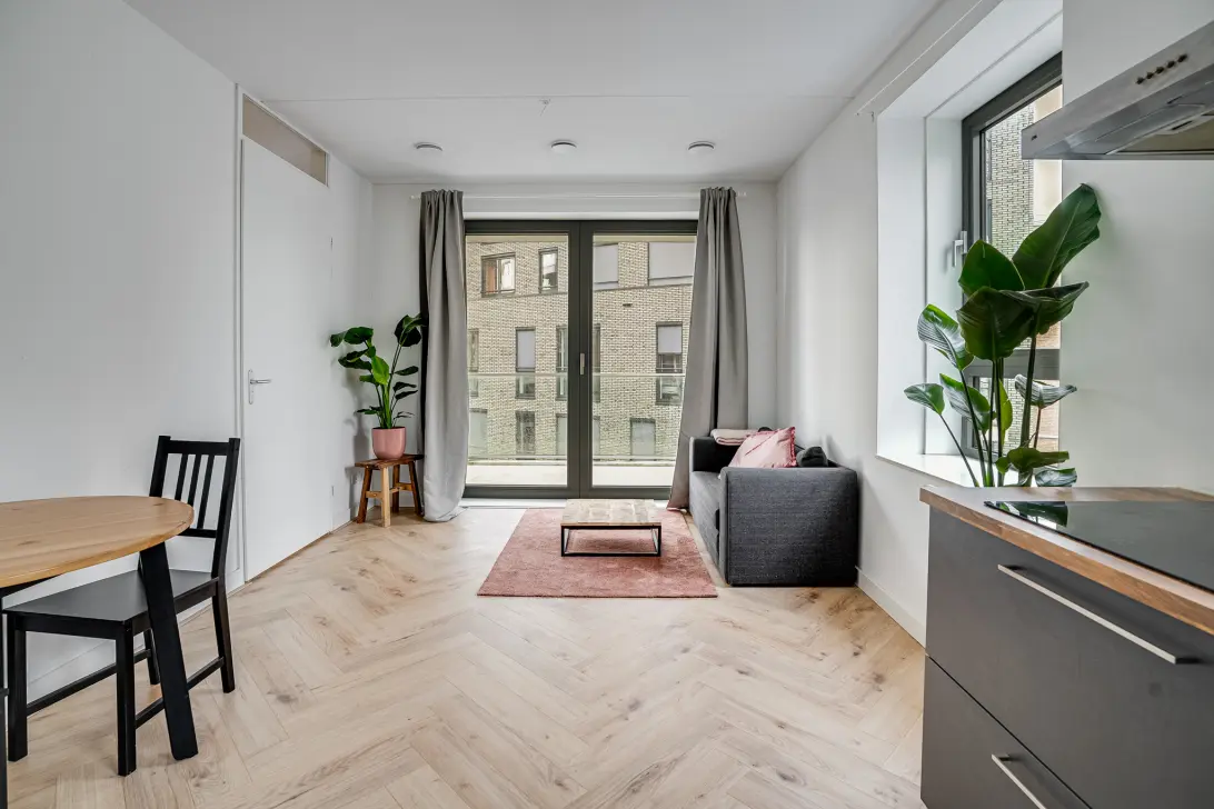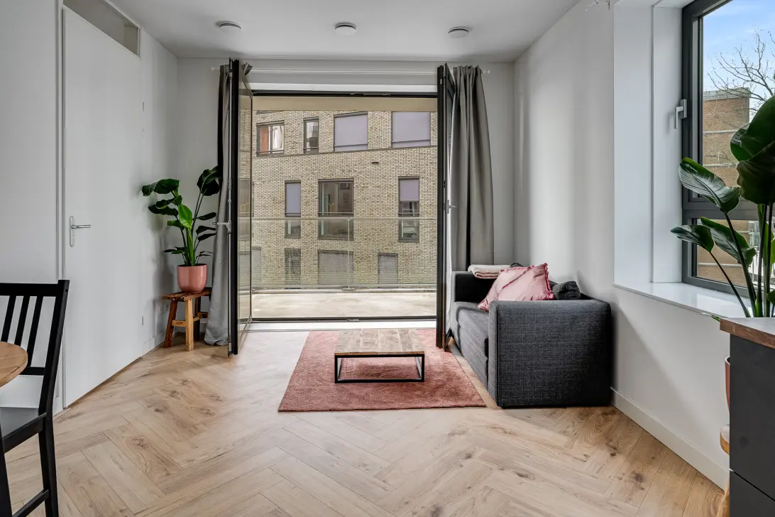 De leefruimte is multifunctioneel en heerlijk licht. Openslaande deuren zorgen voor een optimale verbinding met het balkon en de keuken, uitgevoerd in fraaie kleuren, is voorzien van alle benodigde inbouwapparatuur: een inductie kookplaat, afzuigkap, vaatwasser, combi-oven en een koelkast met vriesvak. Verder is er ruimte voor een eettafel en een slaapbank, die je kunt omtoveren tot bed. Of kies je voor een andere indeling?
