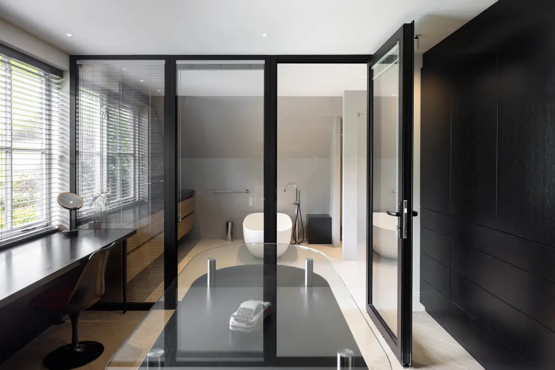 De master bedroom aan de achterzijde is een oase van rust: ruim, licht en met zicht op het groen. Via glazen deuren bereik je de riante inloopkast met luxe, op maat gemaakte kledingkasten en geïntegreerde verlichting. Aansluitend bevindt zich de exclusieve badkamer, ingericht met een vrijstaand Dado Quartz ligbad, maatwerk wastafelmeubel (Assenti) met zwart natuurstenen blad, een ruime inloopdouche en een toilet. Alles in een serene en stijlvolle afwerking.