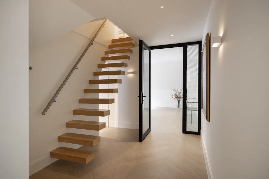 De entreehal is voorzien van een moderne toiletruimte, meterkast en alarminstallatie. Via een stijlvolle stalen taatsdeur betreed je de living: een riante, lichte ruimte met een hoogwaardige keramische visgraatvloer, voorzien van vloerverwarming.