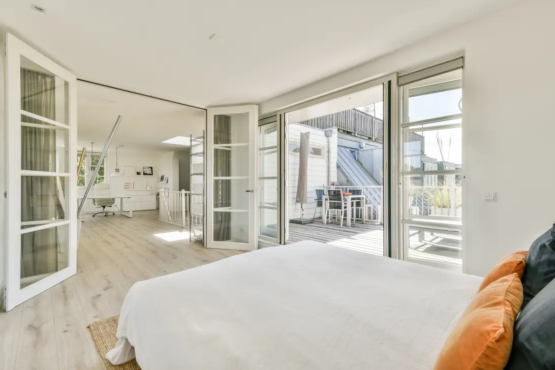 Via een scheidingwand met veel glas en dubbele deuren is de master bedroom gescheiden van de overige ruimtes, die naar wens kunnen worden ingericht als extra slaapkamers, werkkamer, logeerkamer, sportruimte of atelier. Zowel de open ruimte als de master bedroom bieden toegang tot het terras, waar het heerlijk vertoeven is, met een gunstige zonligging op het zuidwesten; zon vanaf de ochtend tot zonsondergang!