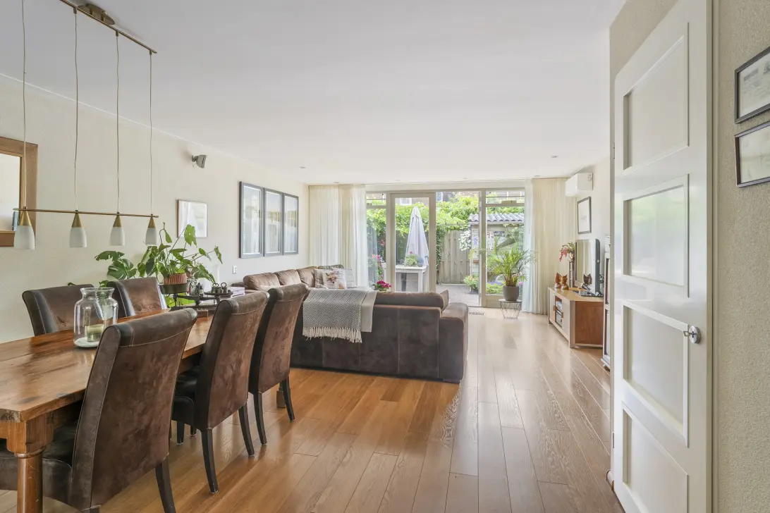 De uitgebouwde, tuingerichte living met openslaande deuren naar de zonnige tuin biedt veel licht en ruimte. De moderne keuken is voorzien van diverse inbouwapparatuur, waaronder een Quooker. Verder beschikt de woning over airconditioning op alle drie verdiepingen, 10 zonnepanelen en vloerverwarming op de begane grond.