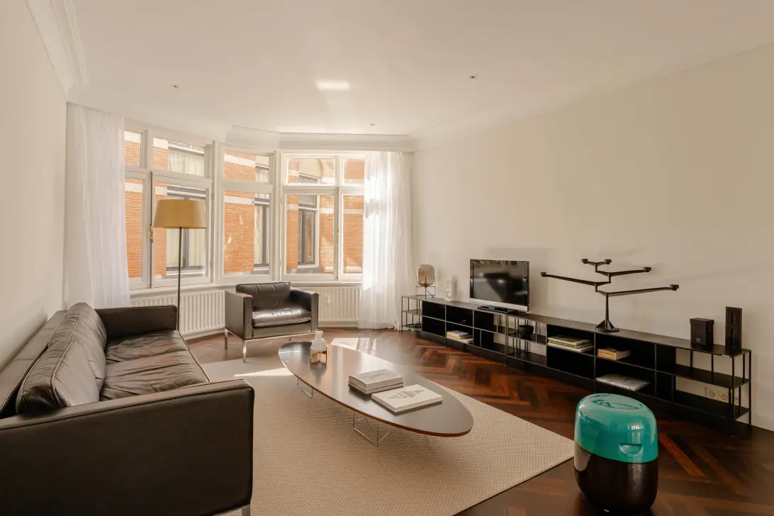 De woonkamer kenmerkt zich door authentieke details, zoals sierlijsten, een open haard met klassieke schouw, een fraaie wengéhouten visgraadvloer en stijlvolle lambrisering. De openslaande deuren naar het Frans balkon zorgen voor een prettige verbinding met buiten. De open keuken is functioneel ingericht en voorzien van diverse inbouwapparatuur en voldoende bergruimte.