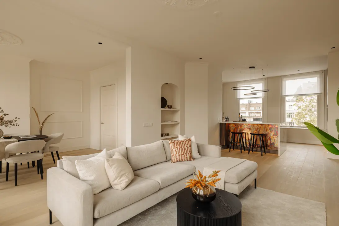 Het appartement biedt een serene en high-end uitstraling met een zee van licht. De bovenste twee etages geven een uniek uitzicht over het Vondelpark en de Zuidas, en tevens zicht op de Vondelkerk en het Rijksmuseum. Op de bovenste verdieping heerst door de panoramische dakramen en het royale dakbalkon een penthouse-achtige sfeer met een rijk ‘New York Central Park’ gevoel.
