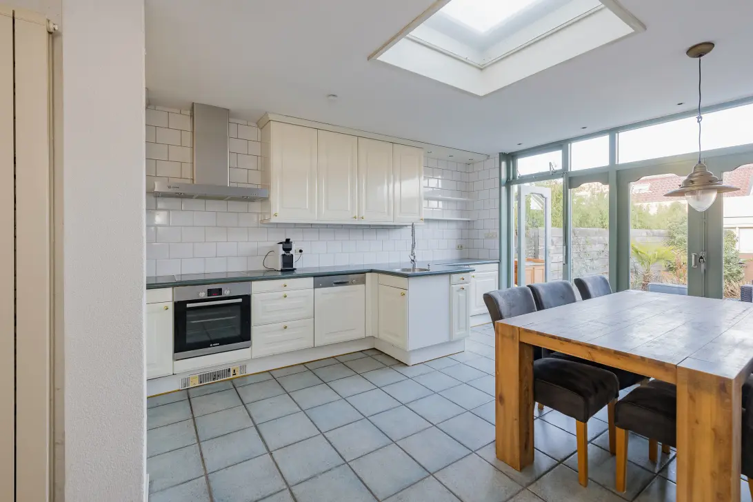 De woning heeft een erker aan de voorzijde, een grote aanbouw aan de achterzijde waardoor er ruimte is ontstaan voor een royale woonkeuken (of indien gewenst een tuingerichte woonkamer) met openslaande deuren naar de achtertuin.