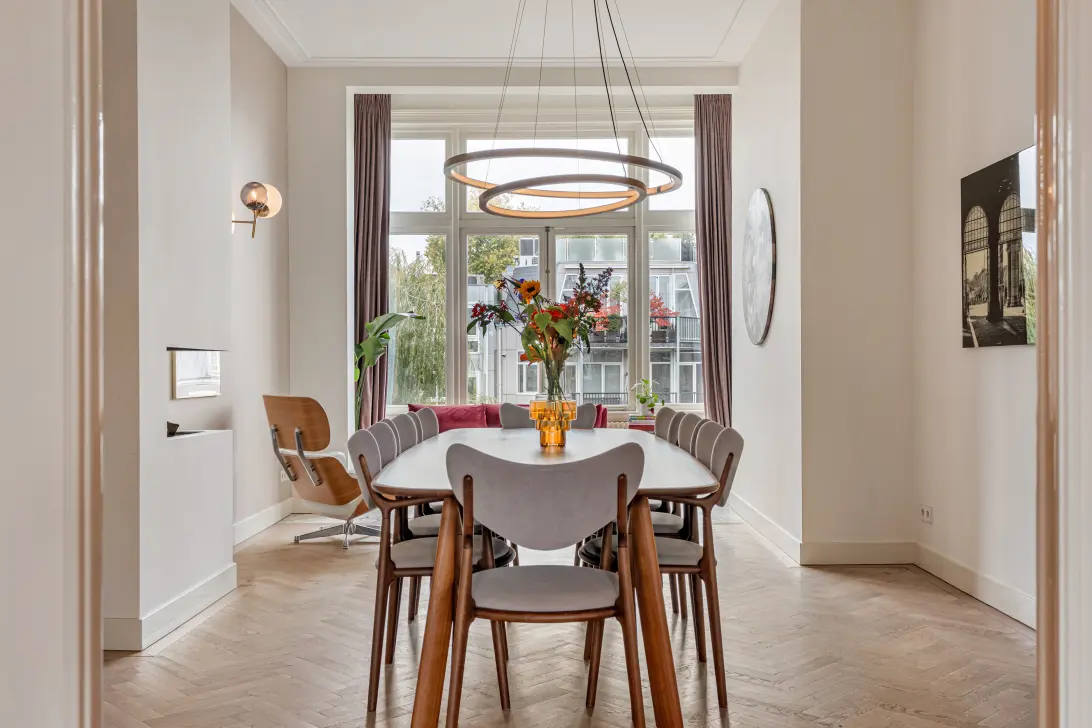 Aan de statige Vossiusstraat, direct grenzend aan het Vondelpark, bevindt zich dit bijzondere bovenhuis van circa 183 m², verdeeld over twee woonlagen met meerdere buitenruimtes, waaronder een royaal dakterras van maar liefst 59 m². De woning combineert het karakter van een klassiek Amsterdams pand met het comfort van een modern woonhuis. Hoge plafonds met originele ornamenten, een lichte visgraatvloer, houten en-suite deuren en marmeren details geven het interieur een tijdloze elegantie, terwijl de indeling en afwerking zorgen voor een gevoel van rust en warmte.