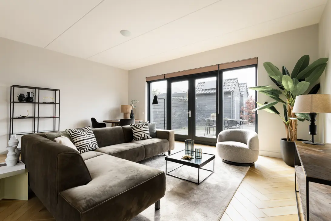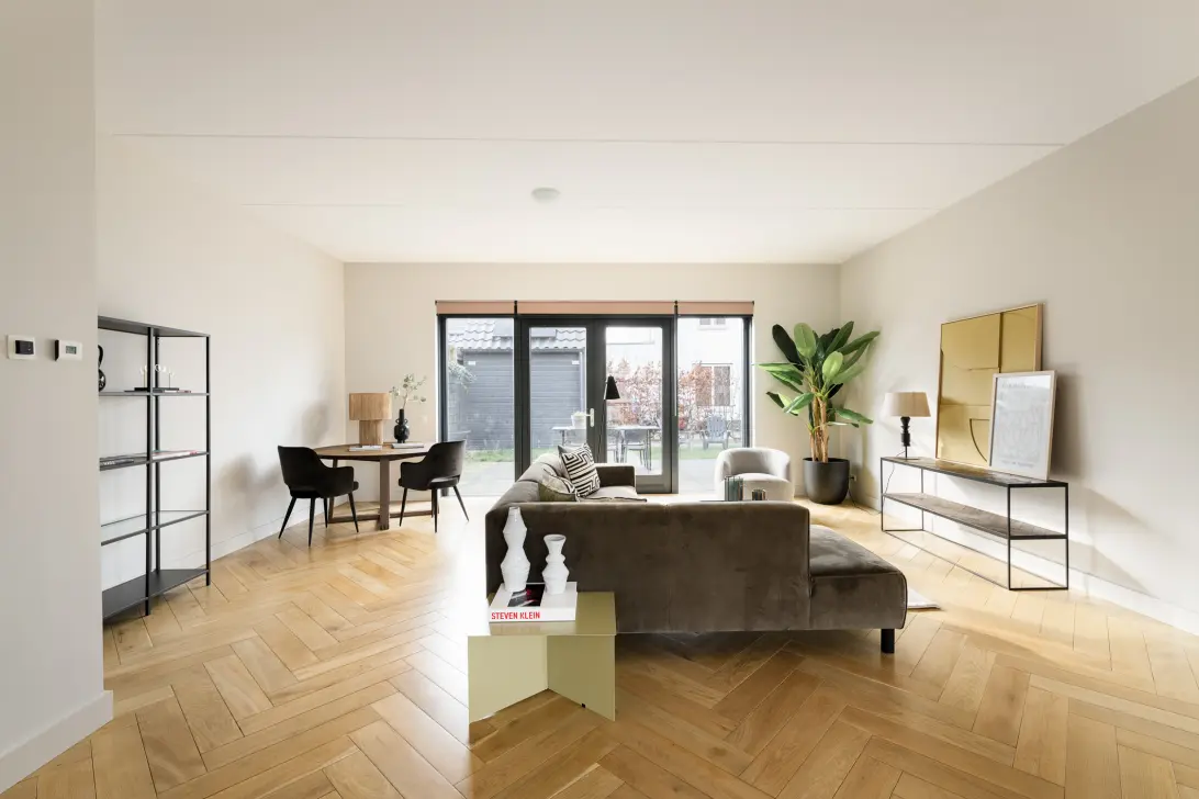 De sfeervolle woonkamer aan de achterzijde is voorzien van een brede visgraat vloer en hoge plafonds van bijna 3 meter. Via openslaande deuren loop je zo de tuin in: een plek waar je na je werk heerlijk tot rust komt in de zon.