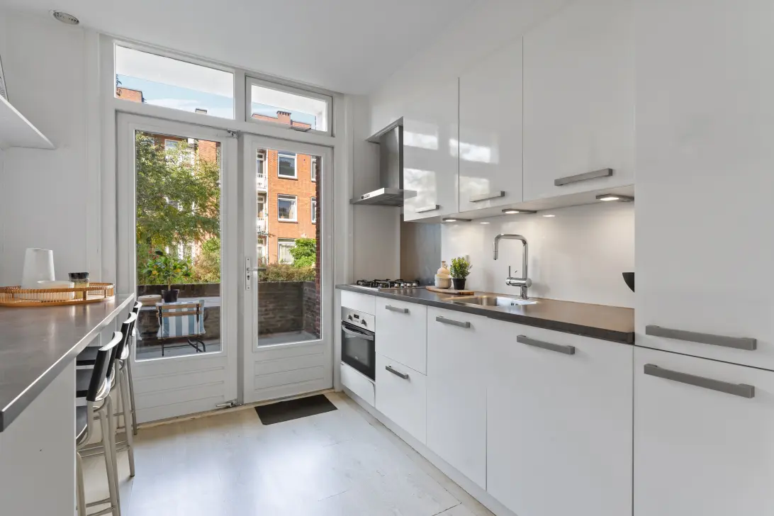 The kitchen, also at the rear, is fitted with a dishwasher, 4-burner gas stove, oven, and fridge/freezer. There’s also a washing machine connection. A wall-mounted breakfast bar is located opposite the countertop – the perfect spot for your morning coffee or a glass of wine while cooking. The kitchen also provides direct access to the terrace. The west-facing terrace enjoys afternoon and evening sun and borders the well-maintained, peaceful communal garden of the homeowners' association (VvE), giving you a sense of privacy and greenery. A utility cabinet on the terrace keeps the central heating system neatly out of sight.
