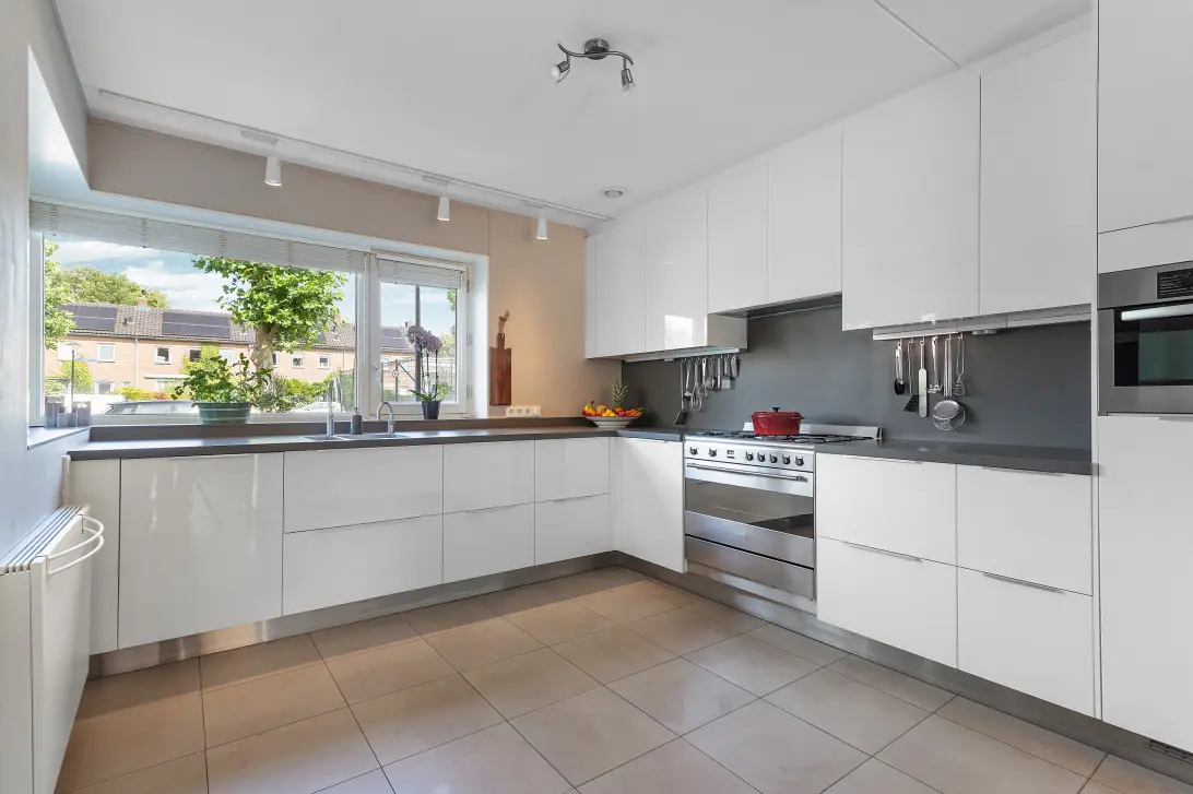 Aan de voorzijde ligt de moderne keuken, compleet uitgerust met hoogwaardige inbouwapparatuur (o.a. Quooker, Smeg-oven en Miele-apparaten). Terwijl je kookt, kijk je gezellig uit over het speelveld voor de deur.